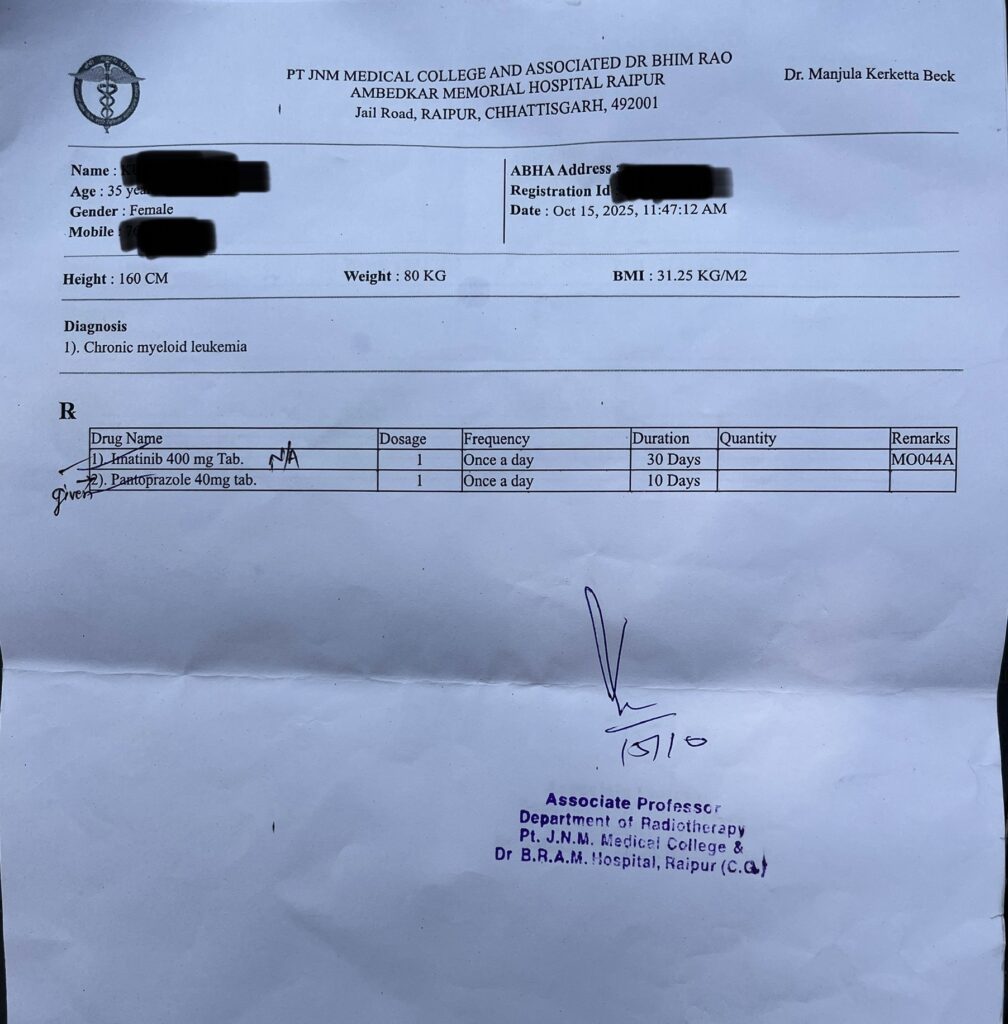 राजधानी रायपुर के डॉ. भीमराव अम्बेडकर मेमोरियल हॉस्पिटल (मेकाहारा) में स्वास्थ्य व्यवस्था की एक चौंकाने वाली हकीकत सामने आई है। 35 वर्षीय महिला मरीज, जिसे Chronic Myeloid Leukemia (CML) यानी खून का कैंसर डायग्नोज़ किया गया है, पिछले कई दिनों से अस्पताल से लिखी गई मुख्य दवा Imatinib 400 mg के लिए भटक रही है। डॉक्टर ने पर्ची में 30 दिनों की दवा लिख दी, लेकिन अस्पताल के दवा स्टोर में यह लाइफसेविंग दवा आज तक उपलब्ध नहीं कराई गई।