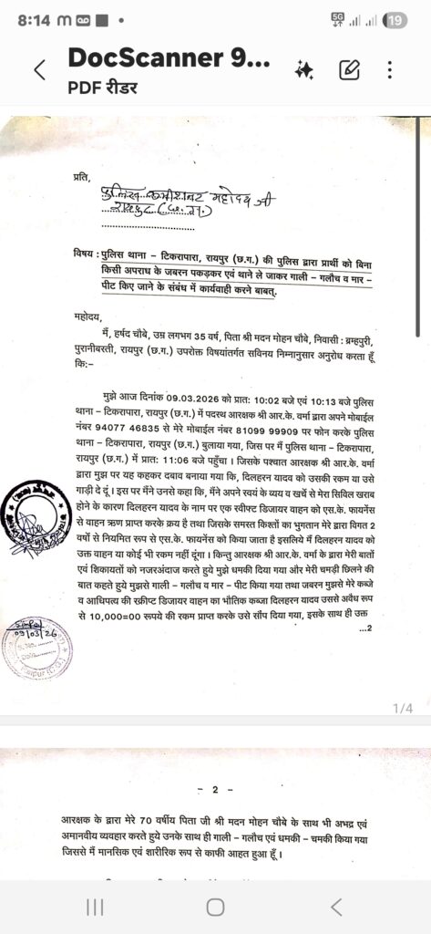 रायपुर। राजधानी रायपुर के टिकरापारा थाना पर गंभीर आरोप लगा है। ब्रम्हपुरी पुरानी बस्ती निवासी हर्षद चौबे (35) ने थाने में पदस्थ आरक्षक एस के यादव पर बिना किसी अपराध के जबरन थाने बुलाकर गाली-गलौच, मारपीट और उनकी कार जबरन छीनकर दूसरे व्यक्ति को दिलाने का सनसनीखेज आरोप लगाया है। पीड़ित हर्षद चौबे के अनुसार 9 मार्च 2026 को सुबह करीब 10:02 और 10:13 बजे आरक्षक एस के यादव ने अपने मोबाइल से फोन कर उन्हें टिकरापारा थाना बुलाया। हर्षद का कहना है कि वह सुबह 11:06 बजे थाने पहुंचे, जहां आरक्षक ने उन पर दबाव बनाते हुए कहा कि वह दिलहरन यादव को उसकी रकम या वाहन सौंप दें।